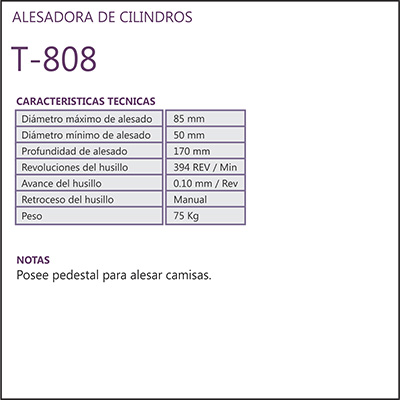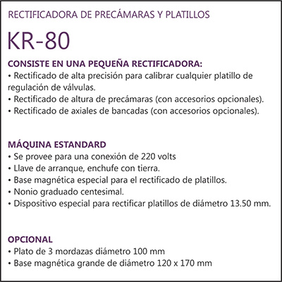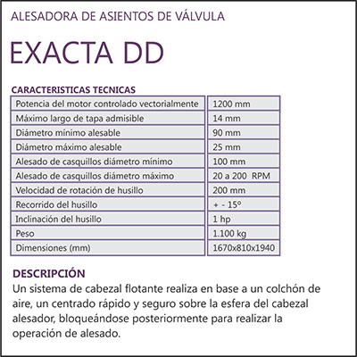 ALESADORA DE CILINDROS Modelo T 807 ALESADORA DE CILINDROS Modelo T 808 RECTIFICADORA DE PRECÁMARAS Y PLATILLOS Modelo KR 80 ALESADORA DE ASIENTOS DE VÁLVULA Modelo EXACTA DD ESCUADRADORA DE BIELAS Modelo KR 200 BRUÑIDORA DE GUÍAS DE VÁLVULA Modelo BGV DIAMOND